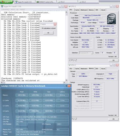 Переходим к тестам второго предоставленного Intel процессора. Полагая, что из-за свободного множителя нам удастся обойти ограничение по частоте QPI и достичь гораздо более высоких частот CPU, сопоставимых с частотами процессором линейки E8x00 и QX9650, мы были разочарованы. С использованием воздушного охлаждения, наш экземпляр остановился на относительно скромной для $1000 процессора частоте в 3.8ГГц. На данной частоте удалось лишь пройти тест SuperPi 32M, получив результат в 9 минут 20 секунд.
