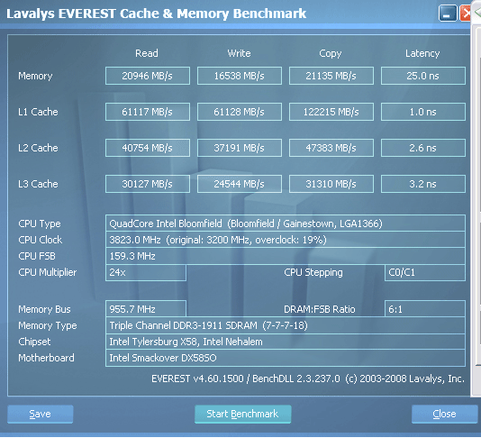 Результаты других тестов не были столь впечатляющи, опять же, из-за довольно низкой частоты CPU. Однако были установлены рекорды обмена информацией с памятью, составившие 21269MB/s и 21.1нс соответственно.