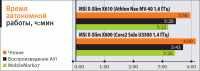 Первый же тест – MobileMark 07 – продемонстрировал реальное положение дел: если на «атомных» устройствах он не проходил вовсе из-за нехватки производительности CPU, то здесь все же завершился успешно. Однако по сравнению с Х600 результат его ничем порадовать не смог: 77 баллов против 119 явно указывают на лидера. Может, Neo удивит нас хотя бы сверхнизким энергопотреблением? 192 мин против 206 у конкурента хоть и выглядят близкими, но все же чуть отстают. Аналогичный результат выдают и остальные тесты на длительность автономной работы (батареи у двух соревнующихся ноутбуков абсолютно одинаковы): Х600 показывает кино 3 ч 43 мин, Х610 – 3 ч 28 мин (потребляемая от батареи мощность – 16,1 и 17,3 Вт соответственно), чтение книги – 4 ч 9 мин у платформы Intel и 3 ч 58 мин – у AMD.