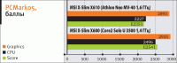 И вот сейчас в Тестовую лабораторию «Компьютерного Обозрения» попал довольно интересный образец «сверхтонкого ноутбукостроения», произведенный Micro Star International – MSI X-Slim X610. Любопытен он в первую очередь тем, что разработчики сделали его максимально похожим на устройство на конкурирующей платформе – X-Slim X600, построенный на Intel CULV. Внеш-не модели практически одинаковы, если не считать цвета корпуса (Х610 – черный, Х600 – белый). Отличия в комплектации, по-видимому, обусловлены желанием снизить цену компьютера на AMD, изготовителям пришлось ограничиться 2 ГБ памяти и 250-гигабайтовым НЖМД. Впрочем, из наших тестов сильно от объема ОЗУ зависит только Photoshop, а размер дискового пространства и вовсе не оказывает на результаты заметного влияния, потому нам в кои-то веки выпала удача сравнить две мобильные платформы практически «лоб в лоб». В пользу AMD также и небольшая фора по тактовой частоте процессора – 1,6 ГГц против 1,4 у Intel – что, по идее, может и нивелировать влияние меньшего объема памяти.